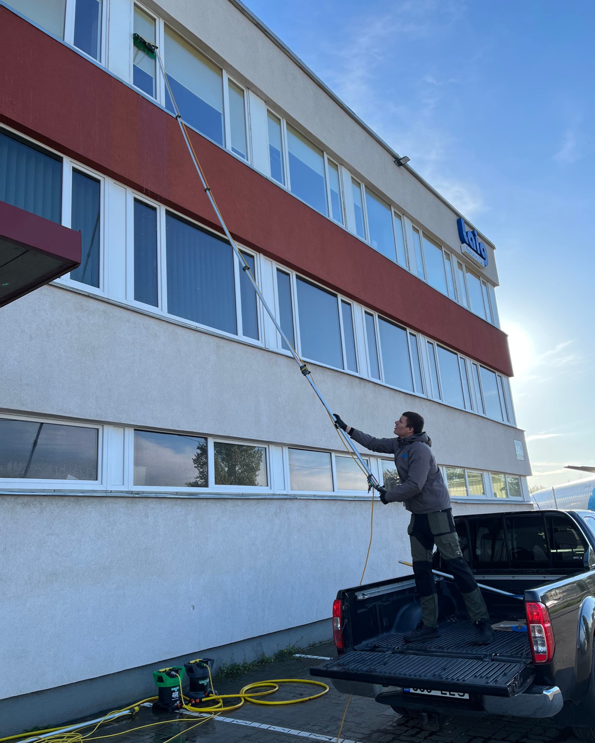 Aknaid, millele tõstukiga ligi ei pääse, peseme professionaalse Hi-Flow teleskoopsüsteemi abil, mis ulatub aknaid pesema kuni 12 m kõrgusel maapinnast.